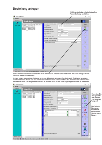Bestellung anlegenNicht ver%u00e4nderbar, die individuellenFelder beliebig ausf%u00fcllen.Eine von Ihnen erstellte Bestelldatei mu%u00df mindestens einen Bauteil enthalten. Bauteile anlegen durchdr%u00fccken dieser Schaltfl%u00e4che.In dem unten angezeigten Beispiel sind nun 4 Bauteile angelegt f%u00fcr die jeweils Teilelisten angelegtwerden k%u00f6nnen. Wenn Sie nun einen Bauteil bearbeiten wollen w%u00e4hlen Sie diesen durch Click auf diebetreffend Zeile. Der angew%u00e4hlte Bauteil ist an dem links in der Zeile angezeigten Haken zu erkennen.Hier rufen Sieden gew%u00e4hlten Bauteilzur Bearbeitung aufDie Schaltfl%u00e4chen erkl%u00e4ren sichselbst wennSie dar%u00fcberfahren.