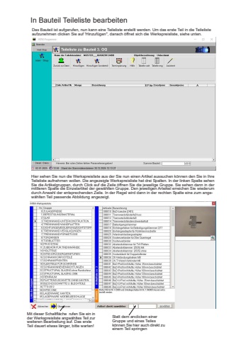 In Bauteil Teileliste bearbeitenDas Bauteil ist aufgerufen, nun kann eine Teileliste erstellt werden. Um das erste Teil in die Teilelisteaufzunehmen clicken Sie auf 'Hinzuf%u00fcgen\Mit dieser Schaltfl%u00e4che rufen Sie ein inder Werkspreisliste angw%u00e4hltes Teil zurweiteren Bearbeitung auf. Das ersteTeil dauert etwas l%u00e4nger, bitte warten!Hier sehen Sie nun die Werkspreisliste aus der Sie nun einen Artikel aussuchen k%u00f6nnen den Sie in IhreTeileliste aufnehmen wollen. Die angezeigte Werkspreisliste hat drei Spalten. In der linken Spalte sehenSie die Artikelgruppen, durch Click auf die Zeile %u00f6ffnen Sie die jeweilige Gruppe. Sie sehen dann in dermittleren Spalte die Einzelartikel der gew%u00e4hlten Gruppe. Den jeweiligen Arteikel erreichen Sie wiederumdurch Anwahl der entsprechenden Zeile. In der Regel wird dann in der rechten Spalte eine zum angew%u00e4hlten Teil passende Abbildung angezeigt.Statt dem anclicken einerGruppe und eines Teilesk%u00f6nnen Sie hier auch direkt zueinem Teil springen