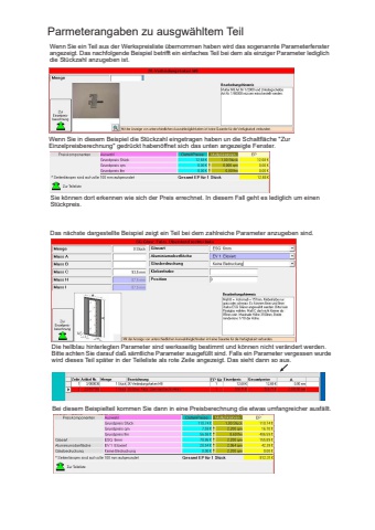 Parmeterangaben zu ausgw%u00e4hltem TeilWenn Sie ein Teil aus der Werkspreisliste %u00fcbernommen haben wird das sogenannte Parameterfensterangezeigt. Das nachfolgende Beispiel betrifft ein einfaches Teil bei dem als einziger Parameter lediglichdie St%u00fcckzahl anzugeben ist.Wenn Sie in diesem Beispiel die St%u00fcckzahl eingetragen haben un die Schaltfl%u00e4che \Einzelpreisberechnung\Sie k%u00f6nnen dort erkennen wie sich der Preis errechnet. In diesem Fall geht es lediglich um einenSt%u00fcckpreis.Das n%u00e4chste dargestellte Beispiel zeigt ein Teil bei dem zahlreiche Parameter anzugeben sind.Die hellblau hinterlegten Parameter sind werksseitig bestimmt und k%u00f6nnen nicht ver%u00e4ndert werden.Bitte achten Sie darauf da%u00df s%u00e4mtliche Parameter ausgef%u00fcllt sind. Falls ein Parameter vergessen wurdewird dieses Teil sp%u00e4ter in der Teileliste als rote Zeile angezeigt. Das sieht dann so aus.Bei diesem Beispielteil kommen Sie dann in eine Preisberechnung die etwas umfangreicher ausf%u00e4llt.