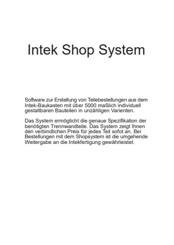 Intek Shop SystemSoftware zur Erstellung von Teilebestellungen aus demIntek-Baukasten mit %u00fcber 5000 ma%u00dflich individuellgestaltbaren Bauteilen in unz%u00e4hligen Varienten.Das System erm%u00f6glicht die genaue Spezifikation derben%u00f6tigten Trennwandteile. Das System zeigt Ihnenden verbindlichen Preis f%u00fcr jedes Teil sofot an. BeiBestellungen mit dem Shopsystem ist die umgehendeWeitergabe an die Intekfertigung gew%u00e4hrleistet.