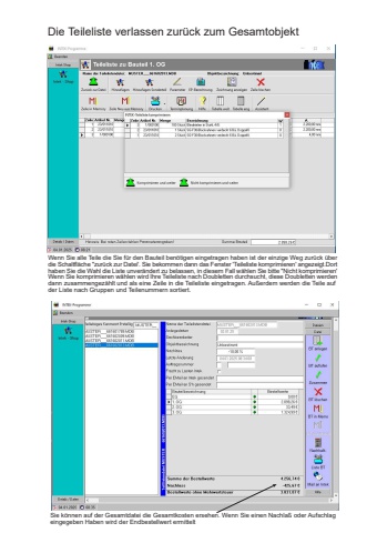 Die Teileliste verlassen zur%u00fcck zum GesamtobjektWenn Sie alle Teile die Sie f%u00fcr den Bauteil ben%u00f6tigen eingetragen haben ist der einzige Weg zur%u00fcck %u00fcberdie Schaltfl%u00e4che \t.Dorthaben Sie die Wahl die Liste unver%u00e4ndert zu belassen, in diesem Fall w%u00e4hlen Sie bitte \eren'Wenn Sie komprimieren w%u00e4hlen wird Ihre Teileliste nach Doubletten durchsucht, diese Doubletten werdendann zusammengez%u00e4hlt und als eine Zeile in die Teileliste eingetragen. Au%u00dferdem werden die Teile aufder Liste nach Gruppen und Teilenummern sortiert.Sie k%u00f6nnen auf der Gesamtdatei die Gesamtkosten ersehen. Wenn Sie einen Nachla%u00df oder Aufschlageingegeben Haben wird der Endbestellwert ermittelt